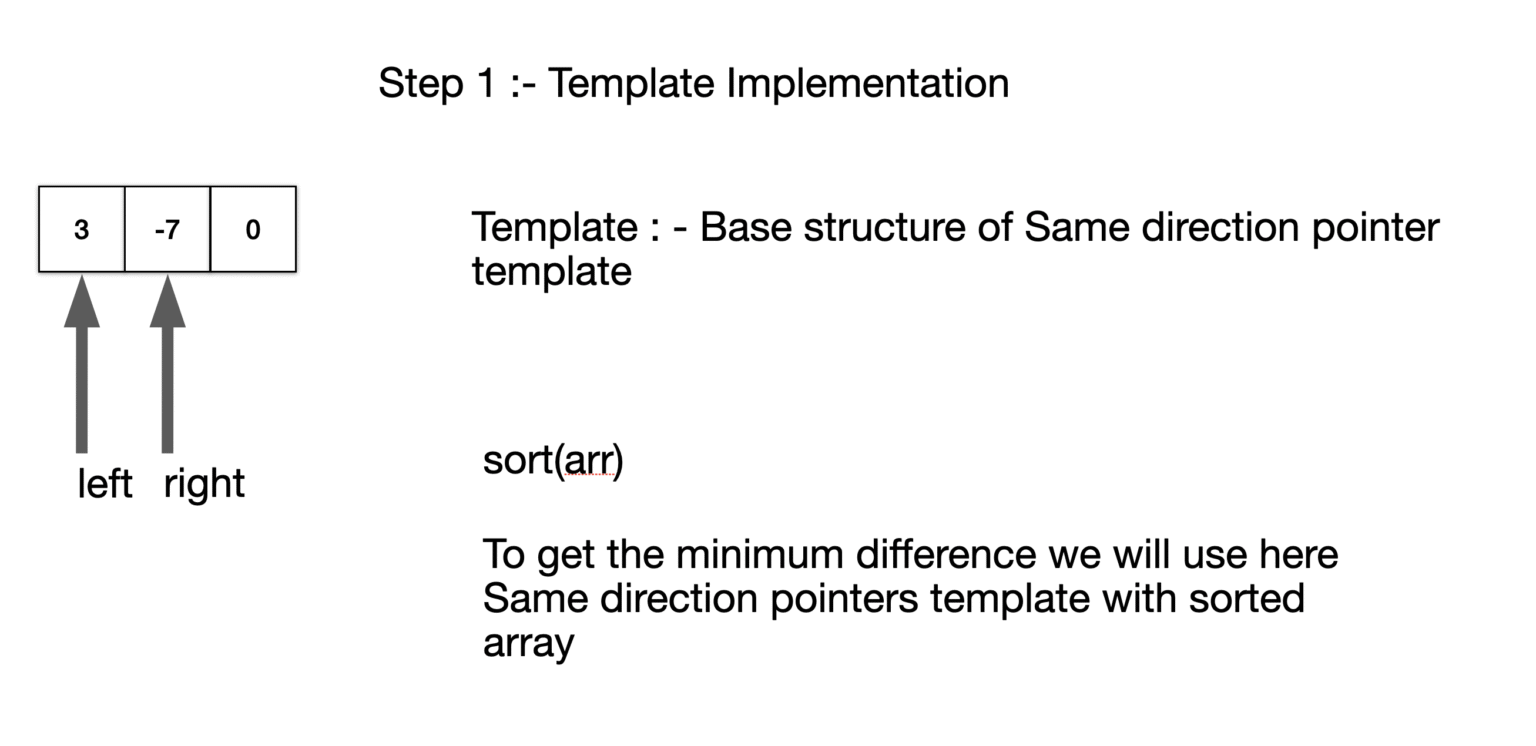 Based on our analysis of the Minimum Absolute Difference in an array problem statement, this is a non-target-based problem where we need to find the minimum absolute difference between adjacent elements. Therefore, we will use the base structure of the same direction pointers template and as per the approach sort the list with Collections sort() method.