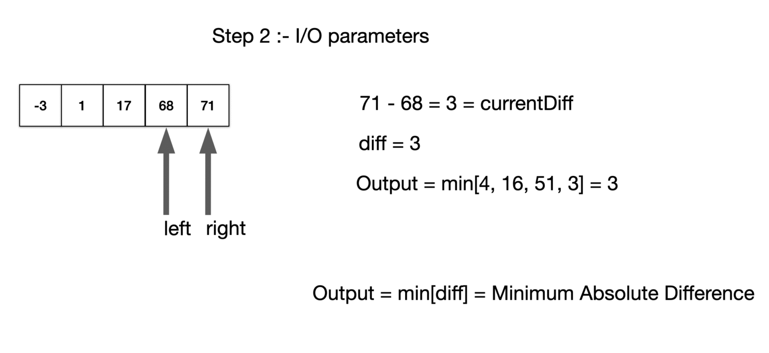 This step calculates the difference between two consecutive elements (arr.get(right) – arr.get(left)) since the array is already sorted, ensuring the result is always non-negative. Then, it updates minDiff with the smallest difference found so far using Math.min(minDiff, diff).